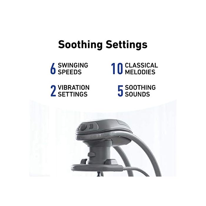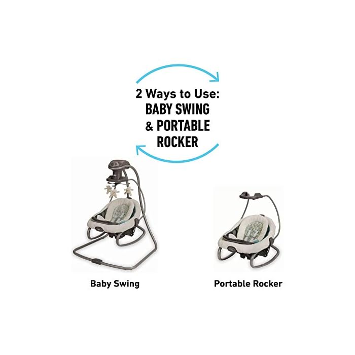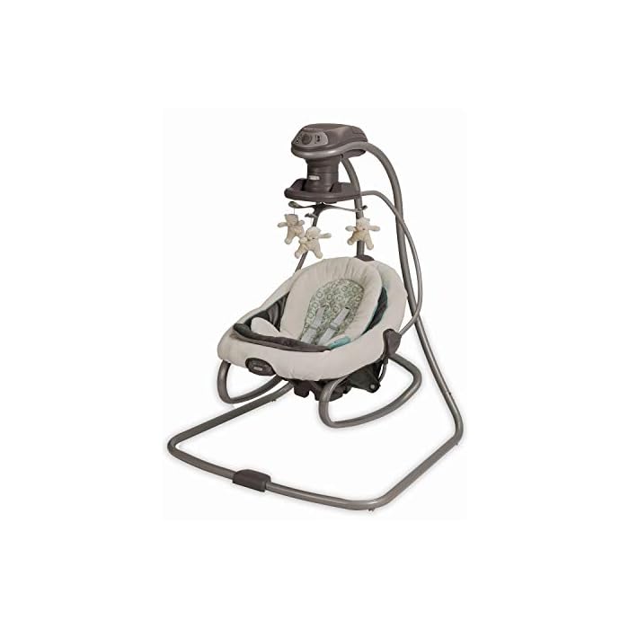 The Graco DuetSoothe Swing and Rocker features an ingenious seat that doubles as a portable rocker, giving you the flexibility to move around the house while keeping baby cozy and close by. In swing mode, 3 swinging directions and 6 speeds allow you to customize the swing to baby’s preferences. With additional features including 2-speed vibration, an overhead toy mobile, and soothing songs and sounds, the Graco DuetSoothe Swing and Rocker gives you even more options to keep baby content.