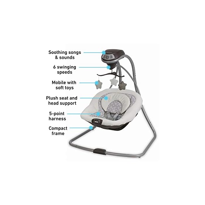 The Graco Simple Sway Swing is fully featured to help you soothe and comfort baby. Gentle, side-to-side swaying and 6 different speeds allow you to customize to baby’s preference. This swing also features 15 songs and sounds, a cozy head support, and soothing two-speed vibration to keep your little one content. The option to plug in or use batteries makes this swing ideal for any room in the home.