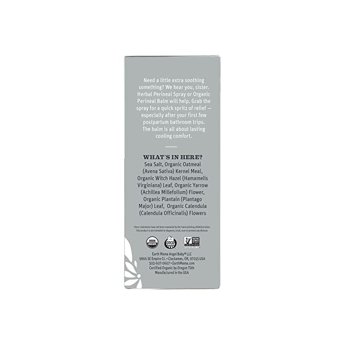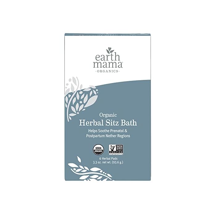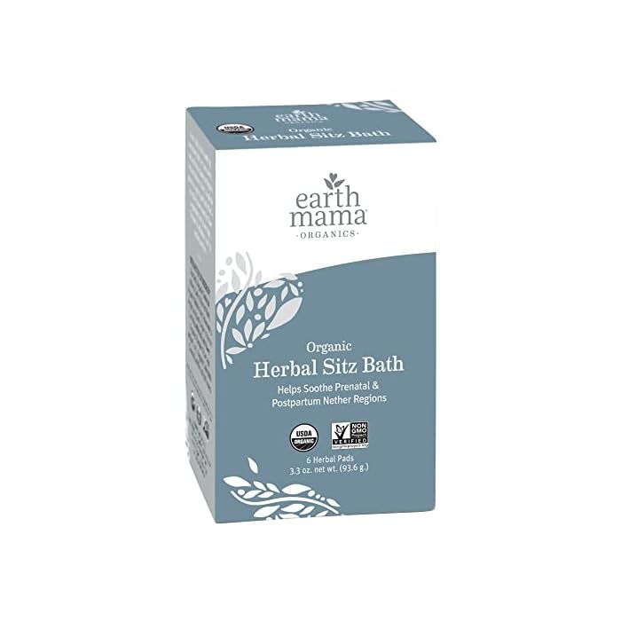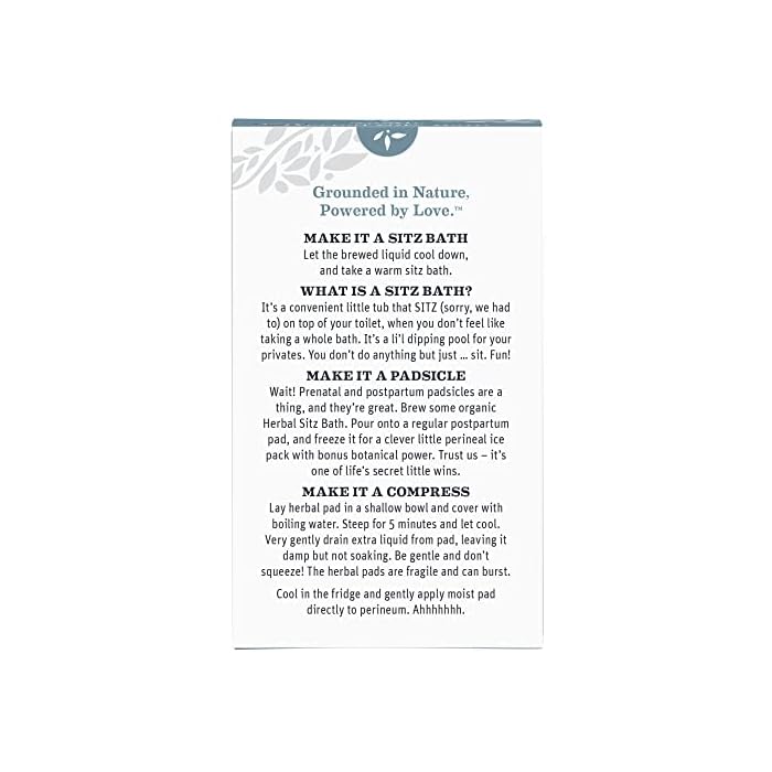 Organic Herbal Sitz Bath Helps Soothe Prenatal and Postpartum Nether Regions. Take care “down there” with natural herbal compresses filled with organic herbs traditionally used to soothe and comfort “down there” during pregnancy or after childbirth. Packed in easy-to-use, individual herbal sachets, each one is perfect for one use. The compresses can be cooled and gently “tucked” to help ease those pretty places, or use the brewed infusion to make postpartum padsicles or use as a sitz bath. USDA Certified 100% Organic by Oregon Tilth, Non-GMO Project Verified, Certified Kosher. About Earth Mama: From the positive test to the big push, from the first latch to the thousandth diaper, Earth Mama Organics makes effective organic and natural herbal products for the whole journey of motherhood: pregnancy, postpartum, breastfeeding, and baby care. We’ve been safely nurturing mamas this way since 2002 — and we wouldn’t do it any other way.