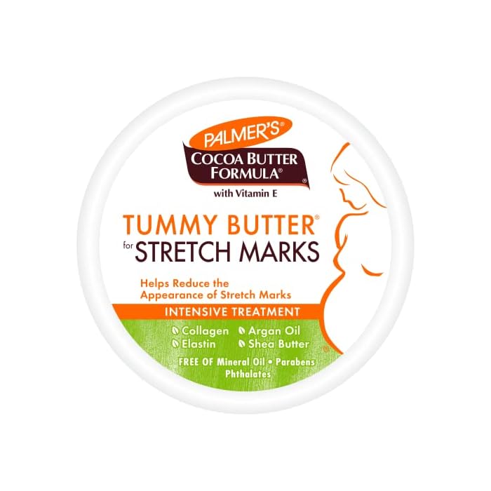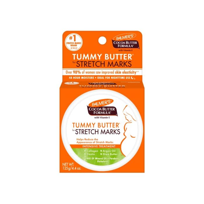 Palmer’s Cocoa Butter Formula Tummy Butter For Stretch Marks, 4.4 Ounces (1 Pack). Palmer’s Cocoa Butter Formula Tummy Butter helps visibly improve skin elasticity and reduce the appearance of stretch marks. Pure Cocoa Butter and Shea Butter, Natural Oils, Collagen, Elastin, and Lutein keep skin moisturized and supple for 48 hours allowing skin to stretch more easily. Widely recommened for stretch marks during and after pregnancy or weight fluctuation.