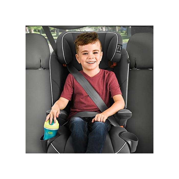 A padded, no-rethread harness with a one-pull tightener provides reassuring security for growing toddlers. The harness easily hides away to create a belt-positioning grow with me car seat with shoulder and lap belt guides for big kids four years and up. Two dishwasher-safe CupFolders feature easy push-button removal and fold out of the way to save space when not in use for a convenient travel car seat.