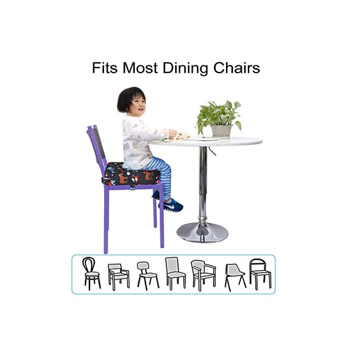 Dimensions: 12.6″L x 3.1″H x 12.6″W, fit most of dining chairs. It can be used for toddler children old who can sit unaided at a table to enjoy the meal with family together. Also can used for children writing, drawing and play toys.