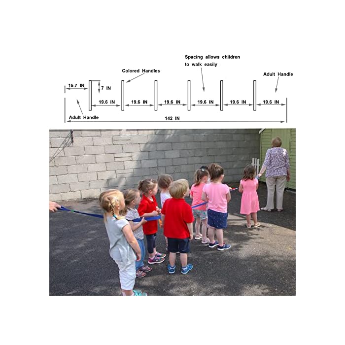Brilliant for 12 Students and 2 Teachers : The total length of the walking rope is approx 12 feet long, each set of handles are positioned 15″- 20″ , has 12 handles and 1 loop at the both ends, there is plenty of space between the handles which allows children walking easily without tripping over.